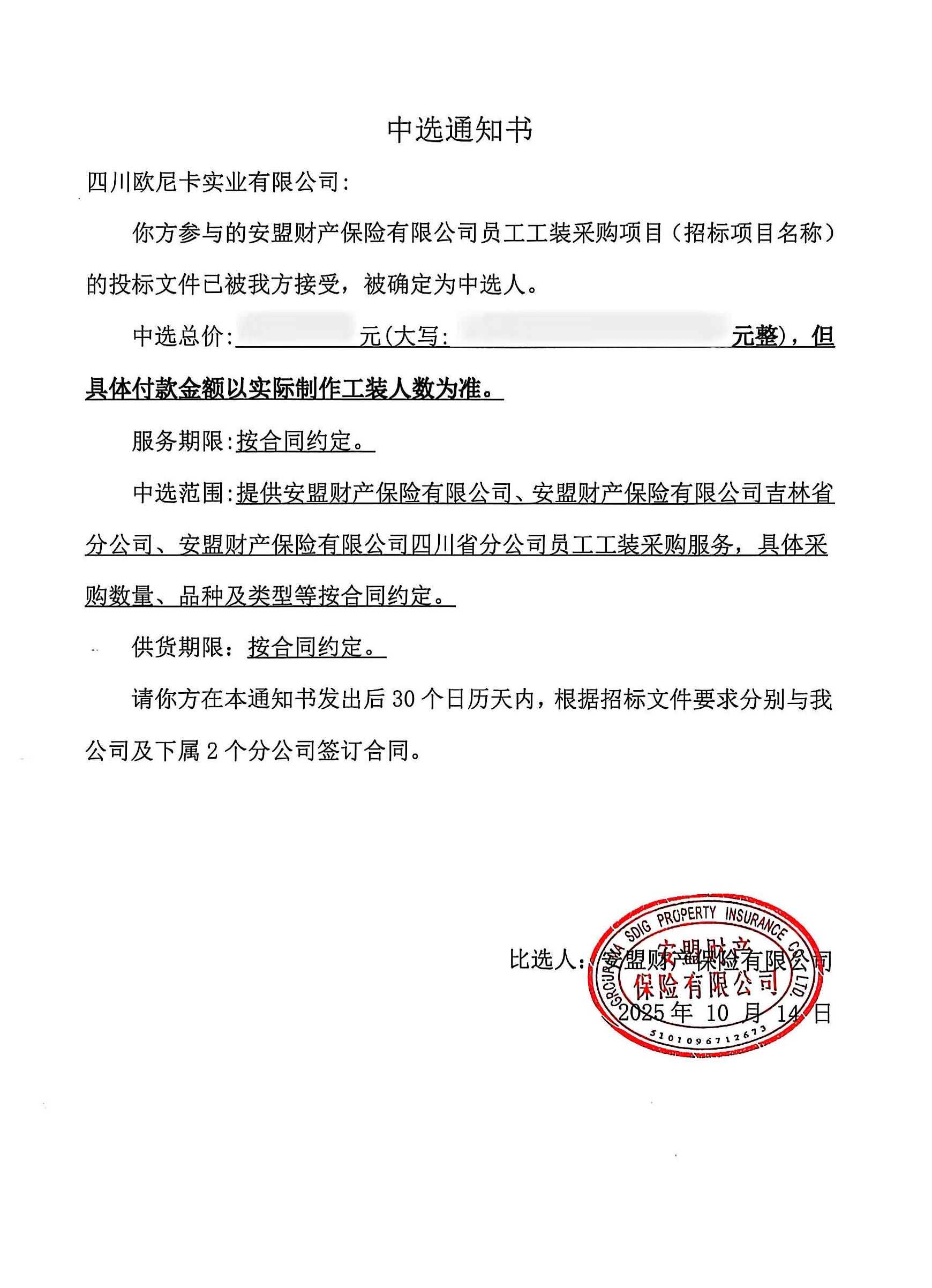 热烈祝贺,欧尼卡中标安盟财产保险有限公司员工工装采购项目!