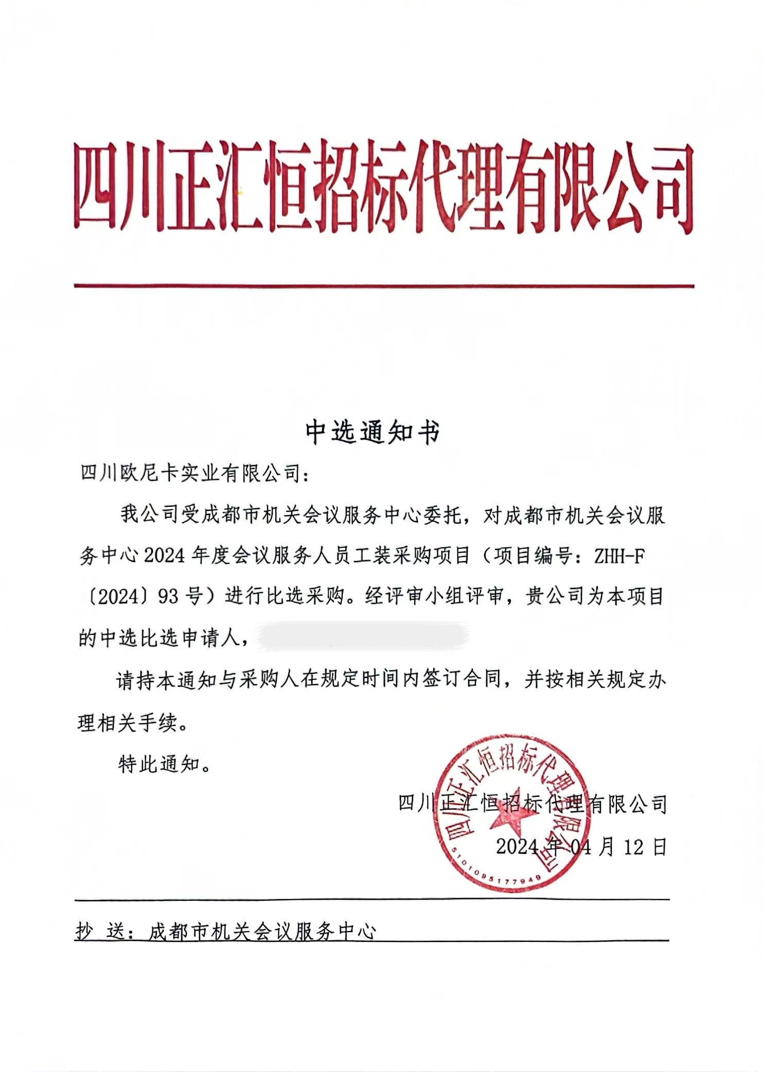 热烈祝贺,四川欧尼卡实业有限公司中标成都市机关会议服务中心2024年度会议服务人员工装采购项目!